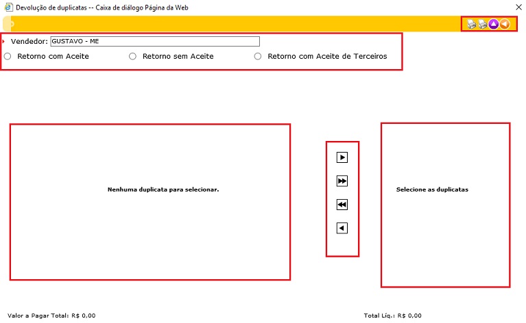 A tela de Aceite de Duplicatas possui sete elementos principais que executam funções distintas.