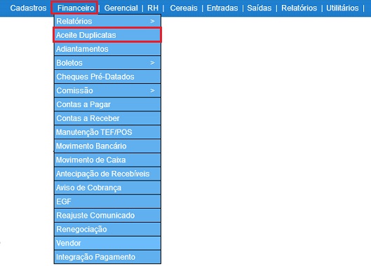 Para acessar Financeiro - Aceite de Duplicatas, use o Menu “ Financeiro – Aceite Duplicatas”.