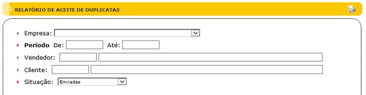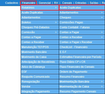 Para acessar este relatório é preciso ir ao Menu “ Financeiro - Relatórios - Aceite Duplicatas”.