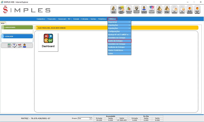 Para acessar esta Tela de Backup NF-e é preciso ir ao Menu “Utilitários - Acerto de Estoque".