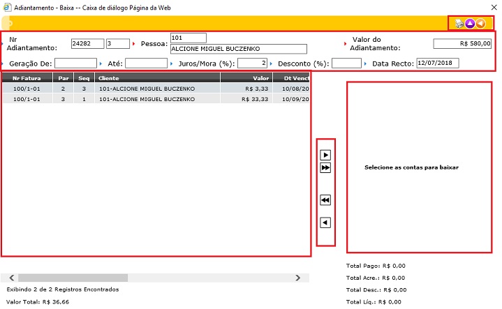 - Baixar usando Contas: O usuário deverá preencher os campos. Para fazer à baixa, o usuário deve clicar no botão baixar os adiantamentos selecionados, e depois fazer a confirmação.