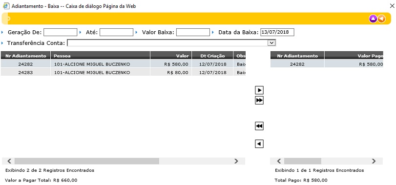 - Baixar este Adiantamento: Ao preencher os campos, o usuário deve selecionar os adiantamentos. Para fazer à baixa, o usuário deve clicar no botão baixar os adiantamentos selecionados, e depois fazer a confirmação.