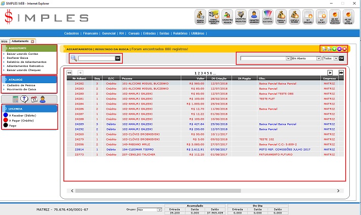 6. Grade de Adiantamentos: Mostra todos os Adiantamentos conforme os filtros descritos anteriormente.