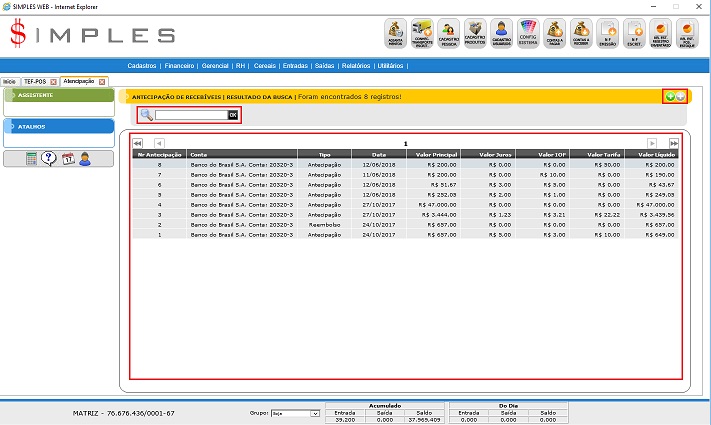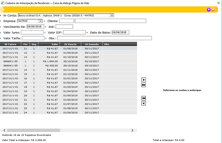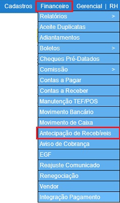Para acessar, use o Menu “ Financeiro – Antecipação de Recebíveis”. Será apresentada a tela principal de Antecipação de Recebíveis.