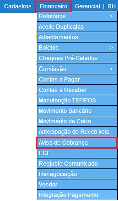 Para acessar, use o Menu “ Financeiro – Aviso de Cobrança”. Será apresentada a tela principal de Aviso de Cobrança.
