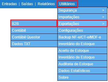 Para acessar a Tela de Importação de Dívidas Bancárias é preciso ir ao Menu “Utilitários – Exportação - B2B”.