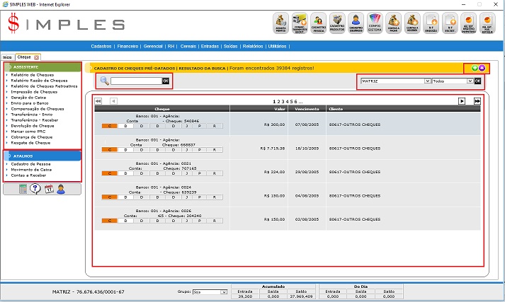 A tela de Cheques Pré-Datados - Seis elementos principais que executam funções distintas, conforme seguem: