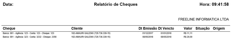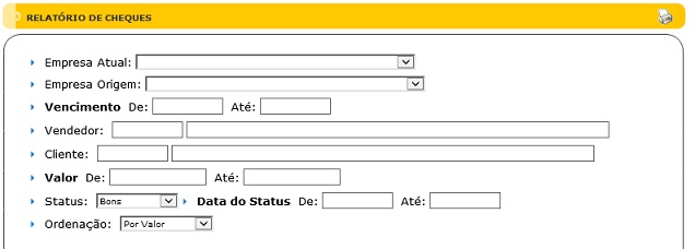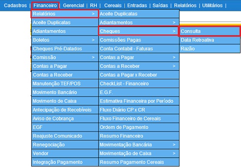 Para acessar este relatório é preciso ir ao Menu “ Financeiro - Relatórios - Cheques - Consulta”.