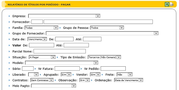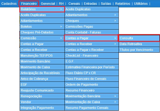 Para acessar este relatório é preciso ir ao Menu “ Financeiro - Relatórios - Contas a Pagar - Consultas”.