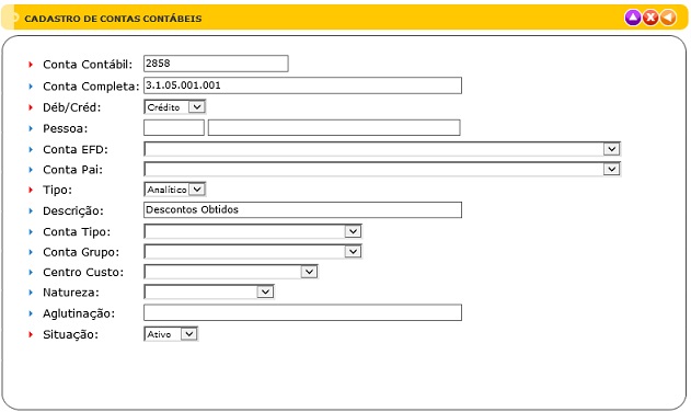 A tela do Cadastro de Contas Contábeis possui quatro elementos principais que executam funções distintas, conforme seguem: