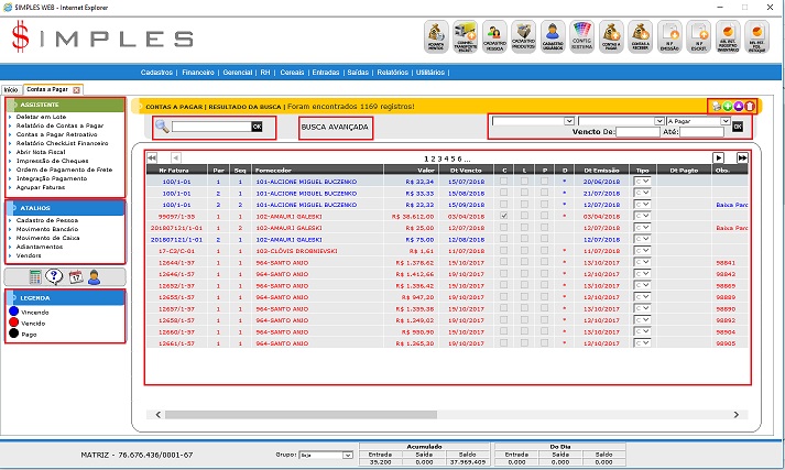 - Grade de Contas a Pagar: Mostra todas as Faturas conforme os filtros descritos anteriormente nos índices 4 e 5.