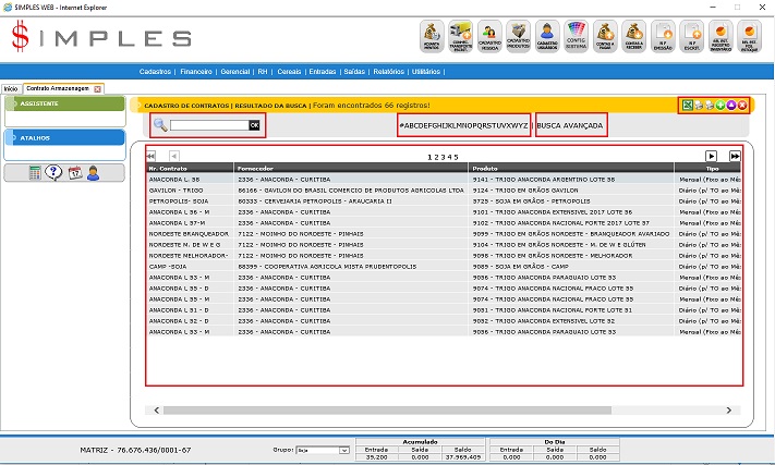 - Pesquisa: Permite executar uma pesquisa genérica usando o Fornecedor, Nr do Contrato, Produto.