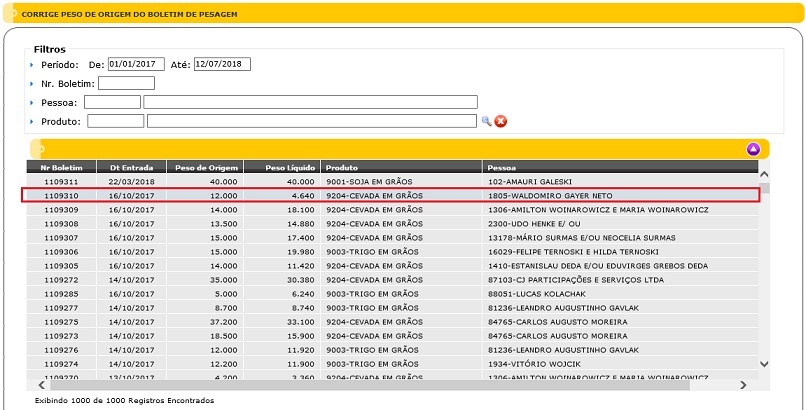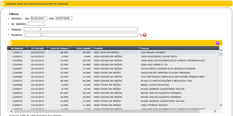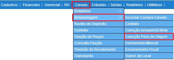 Para acessar, use o Menu “Cereais - Armazenagem - Correção Peso de Origem”.