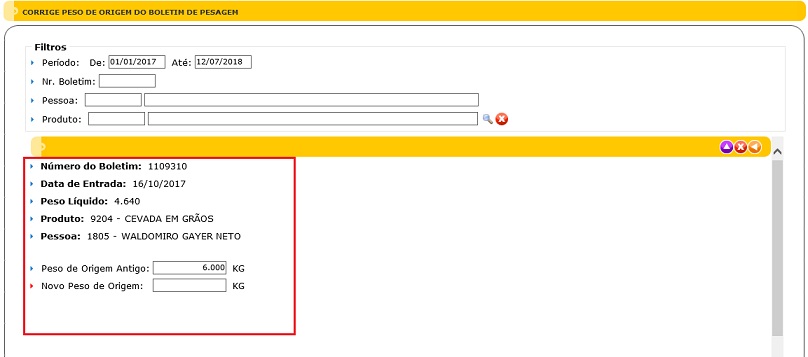 Após preencher o Novo Peso de Origem, é necessário clicar no botão "Alterar" do Navegador para confirmar a nova informação.