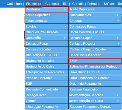 Para acessar este relatório é preciso ir ao Menu “ Financeiro - Relatórios - E.G.F”.