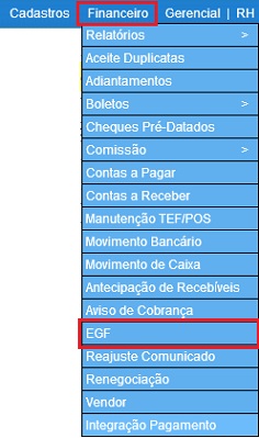 Para acessar este relatório é preciso ir ao Menu “ Financeiro - E.G.F”.