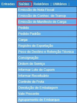 Para acessar a tela de Emissão Manifesto de Carga, use o Menu “Saídas – Emissão Manifesto de Carga”. Será apresentada a tela principal Emissão Manifesto de Carga.