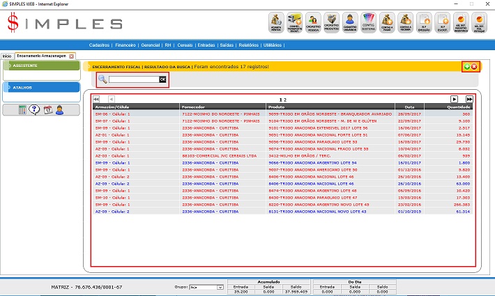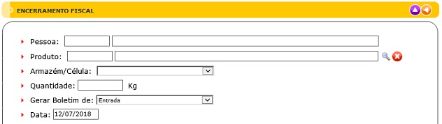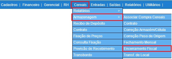 Para acessar, use o Menu “Cereais - Armazenagem - Encerramento Fiscal”.