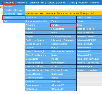 Para acessar o Cadastro de Família, use o Menu “Cadastro - Tabelas - Família”. Será apresentada a tela principal de Família.