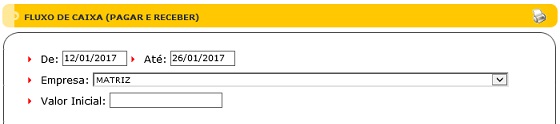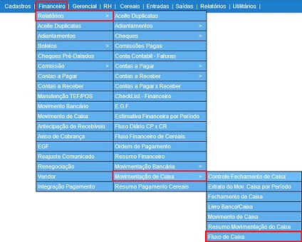 Para acessar este relatório é preciso ir ao Menu “ Financeiro - Relatórios - Movimentação de Caixa - Fluxo de Caixa”.