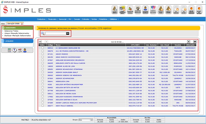 - Grade de Liberações: Mostra todas as pessoas com os cadastros alterados que necessitam de liberação, de acordo com a pesquisa citada anteriormente.