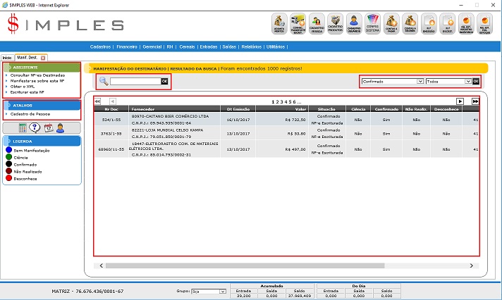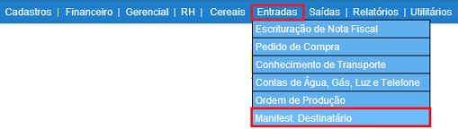 Para acessar Manifestação de Destinatário, use o Menu “ Entradas - Manifestação de Destinatário”. Será apresentada a tela principal de Manifestação de Destinatário.