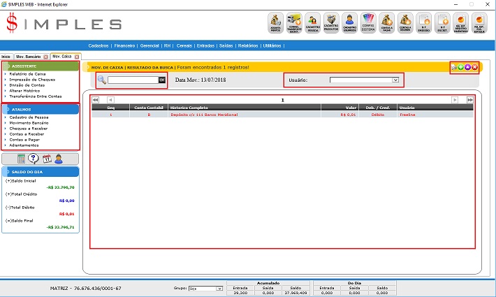 A tela de Movimento de Caixa - Dois elementos principais que executam funções distintas, conforme seguem: