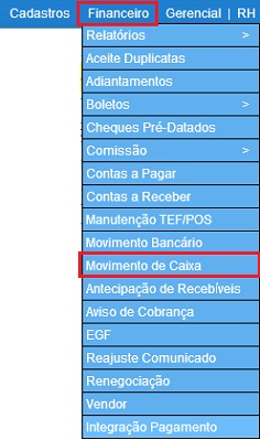 Para acessar Financeiro – Movimento de Caixa, use o Menu “ Financeiro – Movimento de Caixa”. Será apresentada a tela principal de Movimento de Caixa.
