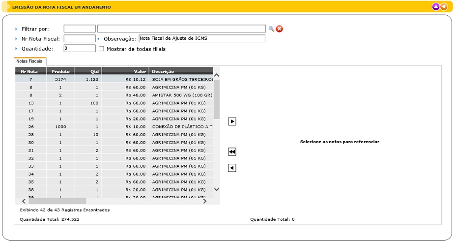 Será apresentada a tela de seleção da nota de origem. Lembre-se que apenas um documento por vez poderá ser referenciado neste caso.