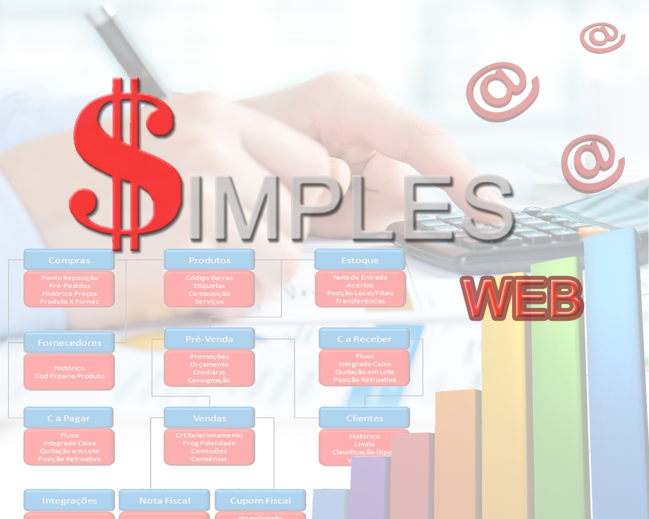 - Financeiro Completo: o $IMPLES WEB possui um módulo financeiro completo, permitindo gerenciar, além do caixa e contas a pagar e receber, os cheques recebidos, os saldos de contas bancárias, adiantamentos, comissões e boletos bancários (com geração de boletos nos padrões do Banco do Brasil, Bradesco, Sicredi, HSBC, Itaú, Bancoob/Sicoob, Santander, Caixa Econômica, Cecred/Acredi/Viacredi, Banrisul). Também pode-se automatizar a impressão de cheques emitidos e recebidos e a impressão de recibos de pagamento/recebimento.