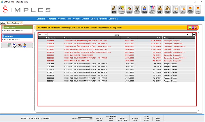 - Grade de Comissões: Mostra as comissões referenciadas.