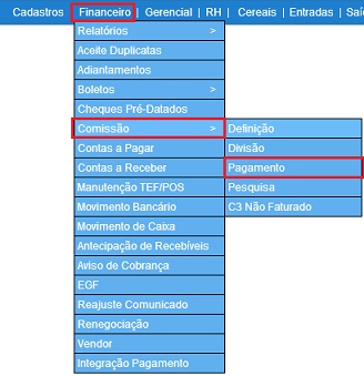 Para acessar Financeiro – Comissão - Pagamentos, use o Menu “ Financeiro – Comissão - Pagamentos”. Será apresentada a tela principal de Comissão - Pagamentos.