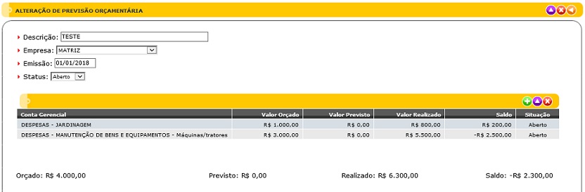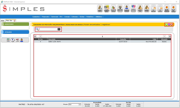 - Grade: Mostra todas as Previsões Orçamentárias cadastradas;