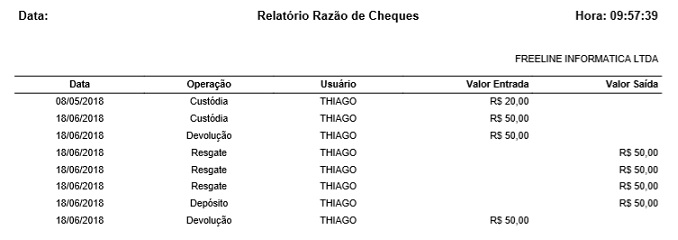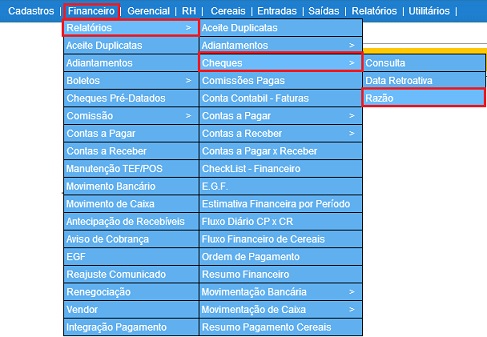 Para acessar este relatório é preciso ir ao Menu “ Financeiro - Relatórios - Cheques - Razão”.