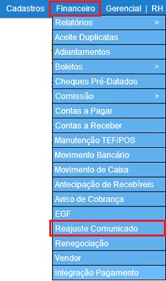 Para acessar este relatório é preciso ir ao Menu “ Financeiro - Reajuste Comunicado”.