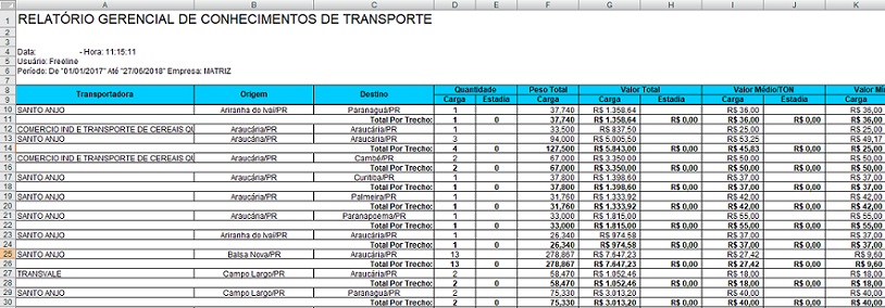 Para acessar, use o Menu “Gerencial - Relatório Conhecimento de Transporte ”.