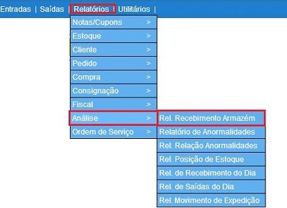 Para acessar este relatório é preciso ir ao Menu “ Relatórios - Análise - Relatório Recimento Armazém"