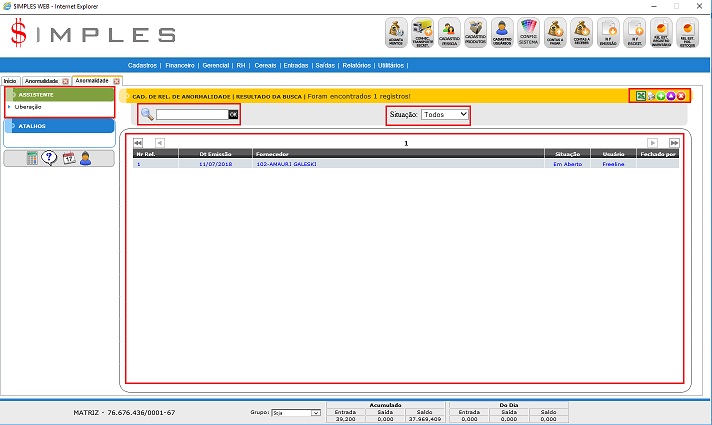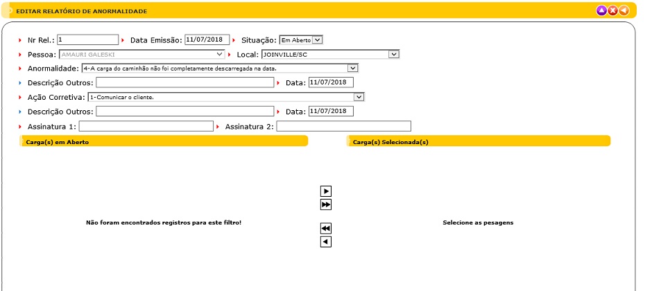 A tela de Relatório de Anormalidades possui cinco elementos principais que executam funções distintas, conforme seguem: