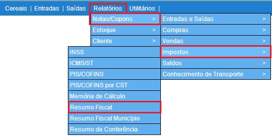 Para acessar este relatório é preciso ir ao Menu “Relatórios-Notas/Cupons - Impostos - Resumo Fiscal”. ”.