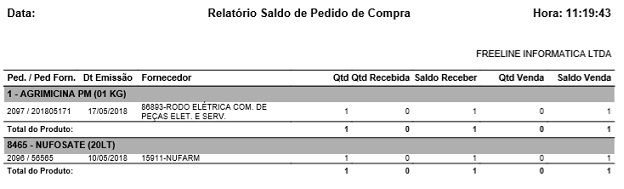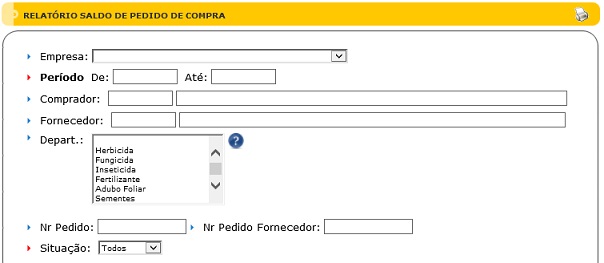 Para acessar este relatório é preciso ir ao Menu “ Relatórios - Compra - Saldo de Pedido de Compra"