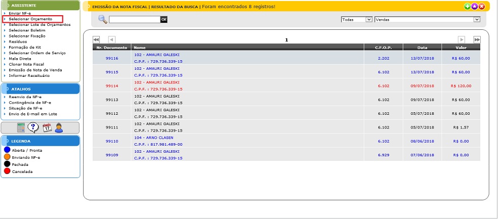 Para fazer uma nota fiscal através de um Orçamento, clique em "Selecionar Orçamento" no menu Assistente da tela de Emissão de Nota Fiscal.
