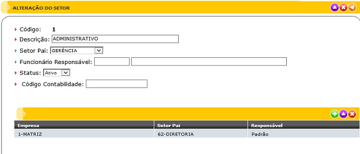 A tela do Cadastro de Setores possui cinco elementos principais que executam funções distintas, conforme seguem: