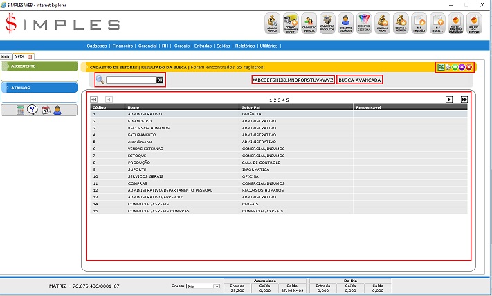 - Busca Avançada: Permite fazer uma busca avançada de Setores com base em todos os campos da tabela.