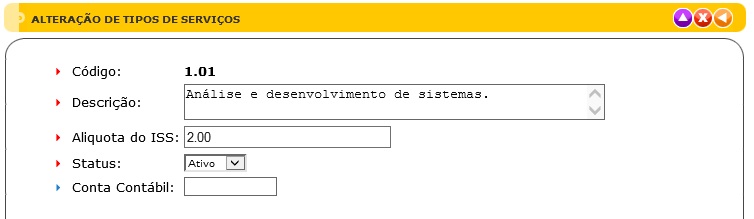 - Para Editar um Tipo de Serviço, o usuário deve selecionar um registro da grade, e clicar no ícone de editar no navegador. Ao editar os dados desejados do registro escolhido, clicar no botão de alterar para confirmar a alteração.