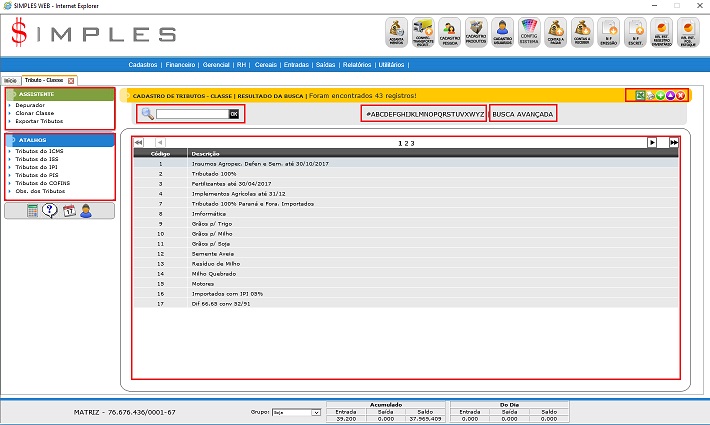 - Pesquisa: Permite executar uma pesquisa usando a descrição dos Tributos - Classes.