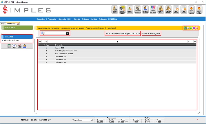 - Busca Avançada: Permite fazer uma busca avançada de Tributos do ISS com base em todos os campos da tabela.