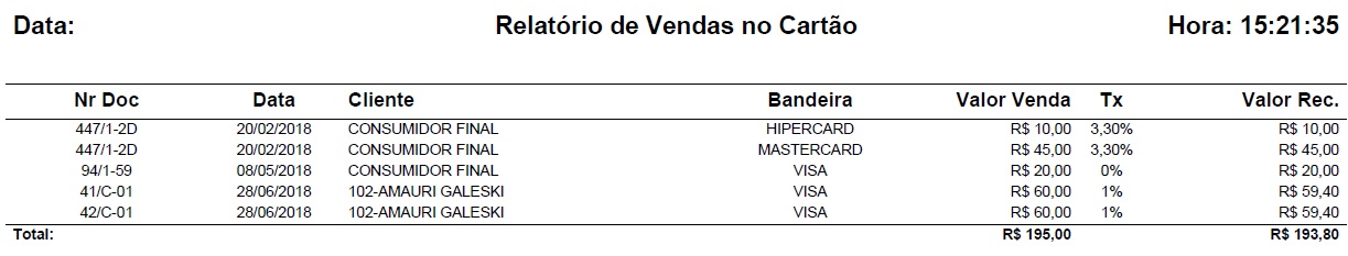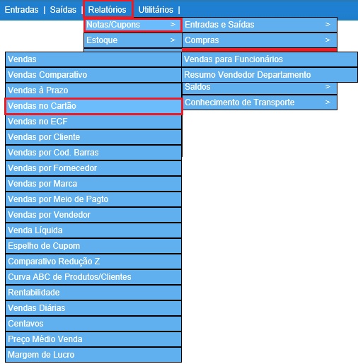 Para acessar este relatório é preciso ir ao Menu “ Relatórios - Notas/Cupons - Vendas - Vendas no Cartão”.